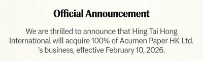 We are thrilled to announce that Hing Tai Hong International will acquire 100% of Acumen Paper HK Ltd.'s business, effective February 10, 2026.